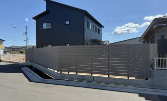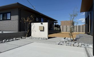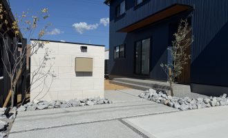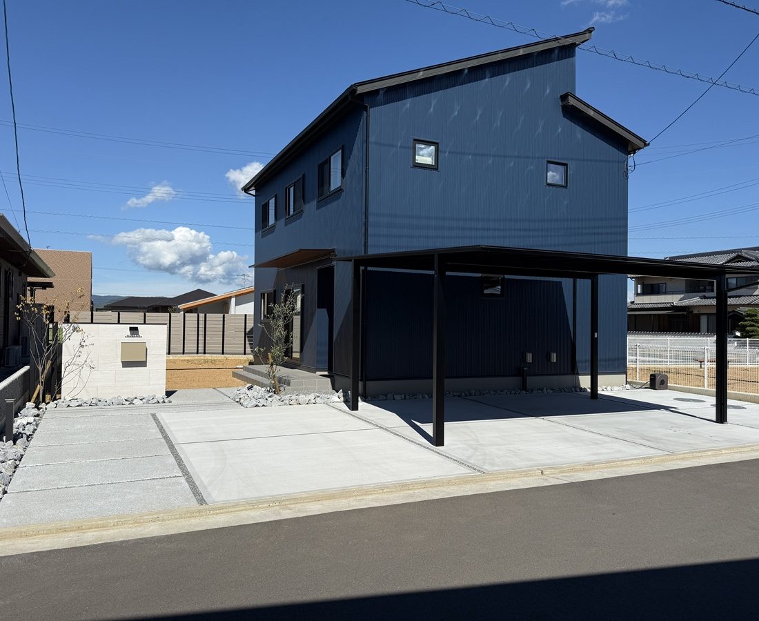 空の青と呼応するようなマットネイビーの住宅が印象的な外構事例です。洗練された外構デザインが、建物の美しさを一層引き立てています。要所に配された植栽がバランス良く配置され、機能的でありながらもモダンで美しいエクステリア空間を創り出しています。日々の暮らしに上質さを添えるデザイン性の高い住空間の完成です。