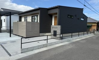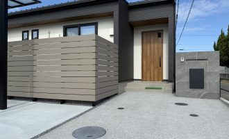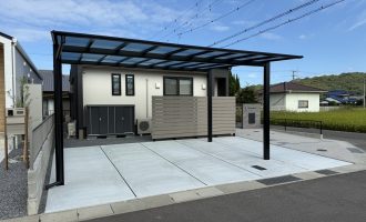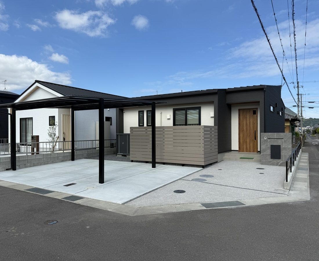 コーナーの敷地を有効活用し、広々とした駐車スペースとアプローチを機能的にゾーニング。カーポートの黒が建物の色と調和する、一体感のあるモダンな外構の施工事例です。