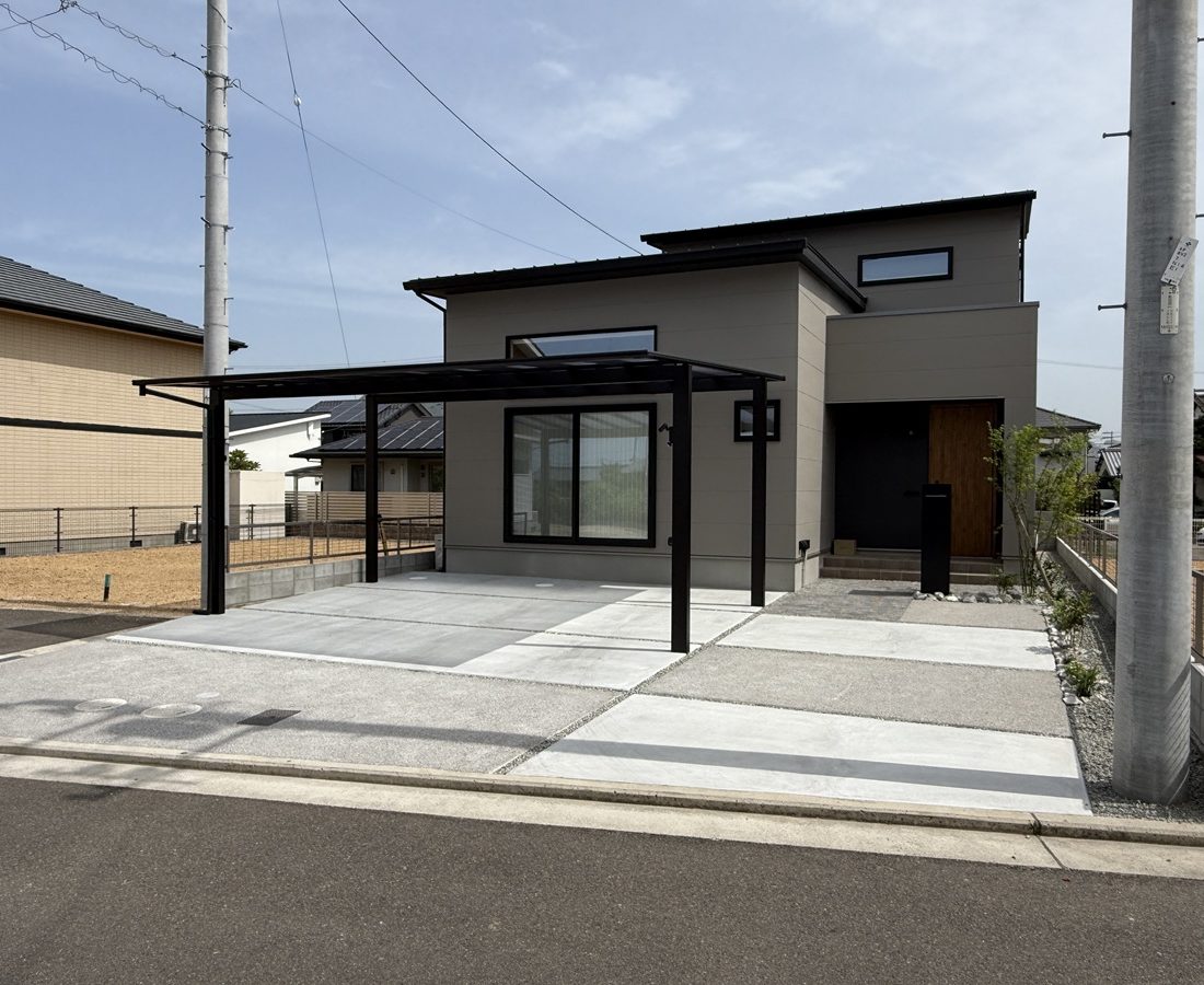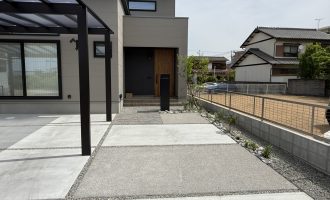 落ち着いたグレージュの外壁が印象的な邸宅に合わせ、外構もトーンを統一した「アーバン・モダン」な提案です。