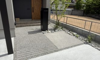 アプローチには洗い出しやボーダーブロックを用い、素材の対比でデザインに深みを出しました。 玄関先の植栽スペースは、石と緑を組み合わせることでメンテナンス性を保ちつつ、住まいに潤いをプラス。 機能性と美しさが高度に融合し、年月が経つほどに愛着がわく、シンプルかつ上質なエクステリアに仕上がりました。